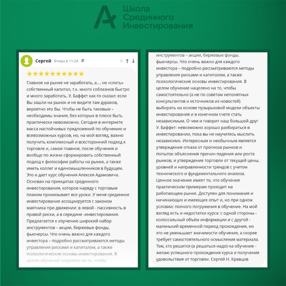 - Дополнительный бонус Бесплатный доступ на месяц к Сообществу Срединного Инвестирования: подписка на закрытые обзоры в Zoom и Telegram-чат